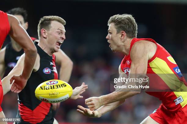 Sam Taylor Of The Giants Right Under Pressure From Nick Holman Of The Suns During The Round 17 Afl Match Between The Gws Giants And Gold Coast Suns At Mars Stadium In